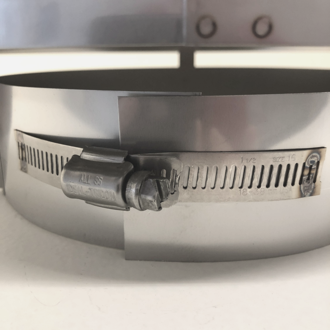 Designed for non-restrictive flow. A screen is built in, and an adjustable gear clamp allows it to fit snug to flex. We have a separate design for oil & gas lining systems.